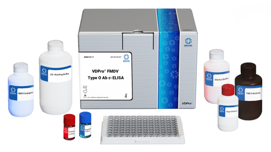 VDPro® FMDV Type O Ab c-ELISA is a diagnostic kit for the detection of antibodies generated by vaccination or infection with foot-and-mouth disease virus (FMDV) Type O in bovine, porcine and goat serum. The kit is a competitive ELISA that specifically detects FMDV antibodies bound to recombinant FMDV type O P13C antigen using anti-FMDV horseradish peroxidase (HRP)-labeled antibodies.