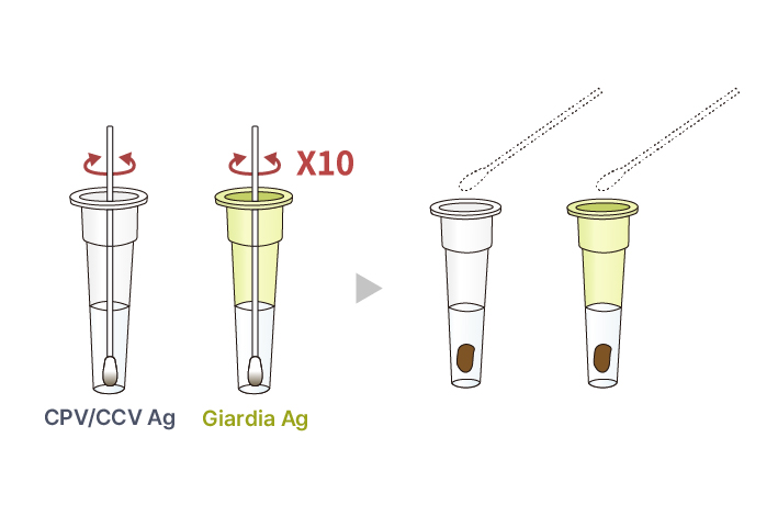 Put the collected feces swabs into the sample dilution buffer for CPV/CCV Ag (Clear) and sample dilution buffer for Giardia Ag (Green), respectively, stir well the solution with swabs in order to extract the virus from the fecal sample thoroughly.