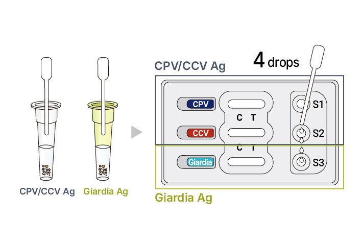 | Kit components | CPV/CCV/Giardia Ag Rapid Device, Sample dilution buffer for CPV/CCV Ag (Clear), Sample dilution buffer for Giardia Ag (Green), Swabs, Dropper, Dilution Buffer Rack, Instruction manual |